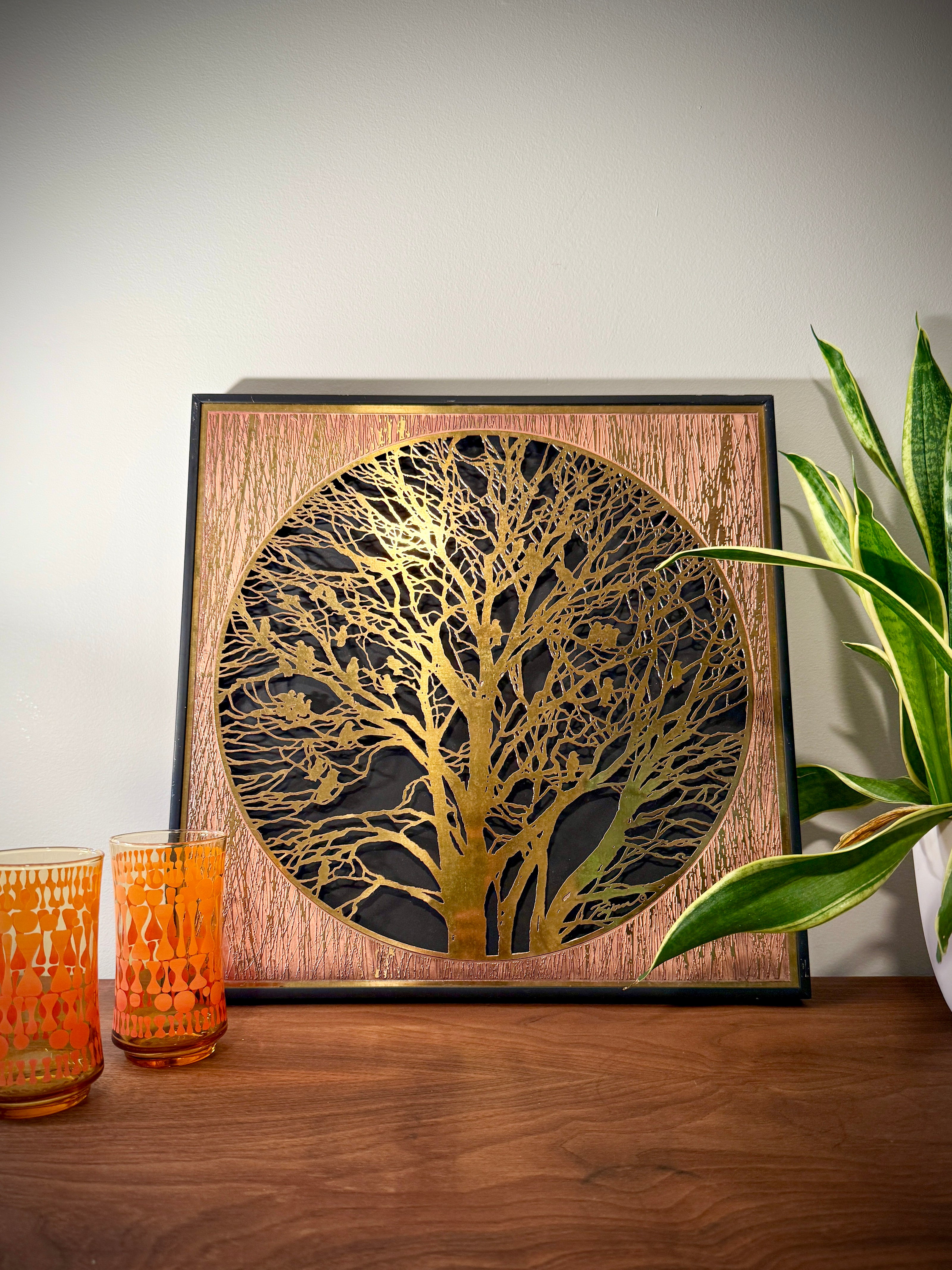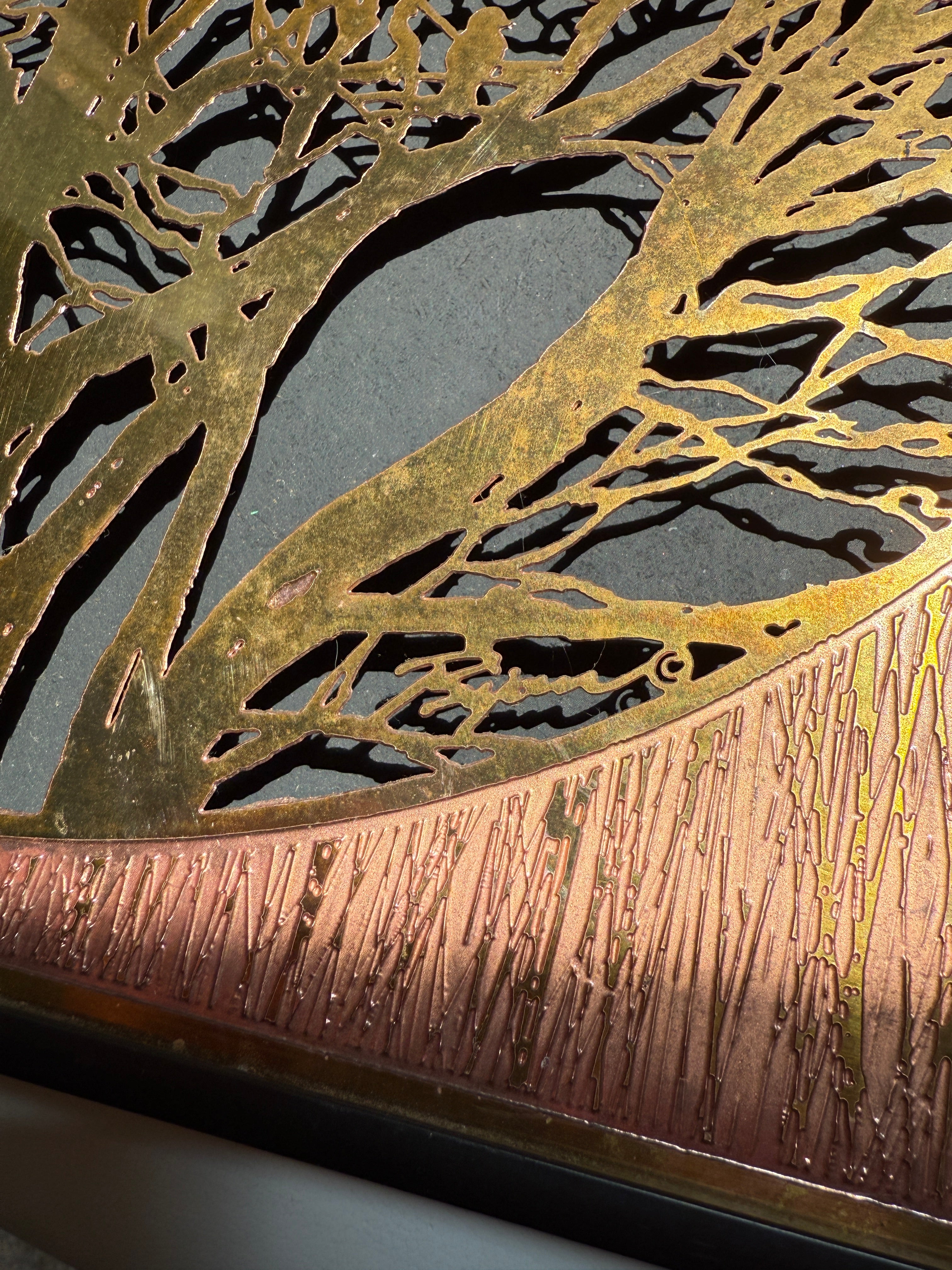🛒 Shop todayA rare original wall sculpture by Bijan, crafted in brass and copper with intricate tree silhouettes. Its luminous metallic finish and organic form bring warmth, texture, and timeless sophistication to any modern interior.