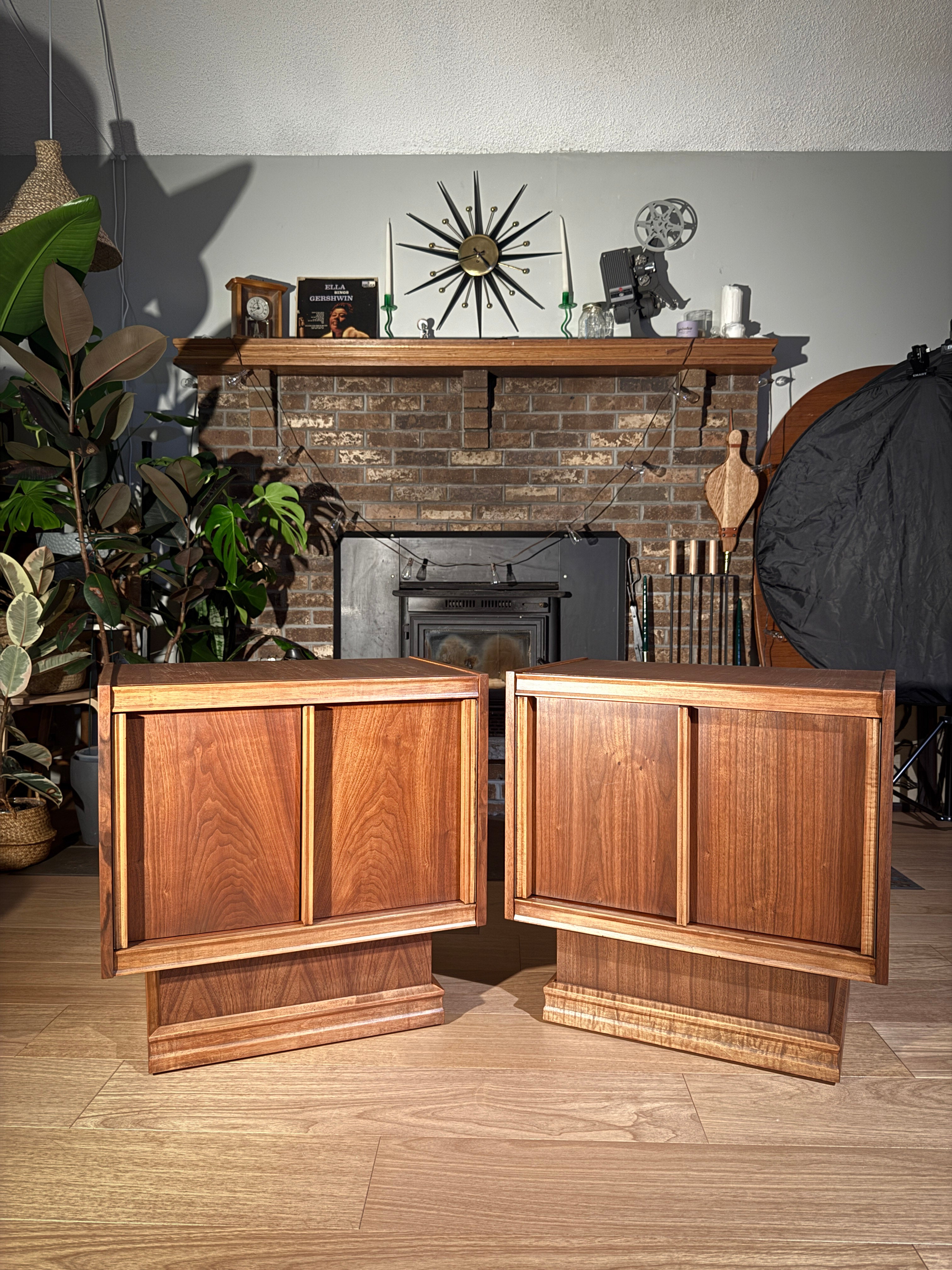 🛒 Shop todayVintage Tobaggo nightstands, showcasing warm walnut grain, architectural lines, and the sculptural balance that defines mid-century craftsmanship and timeless design..