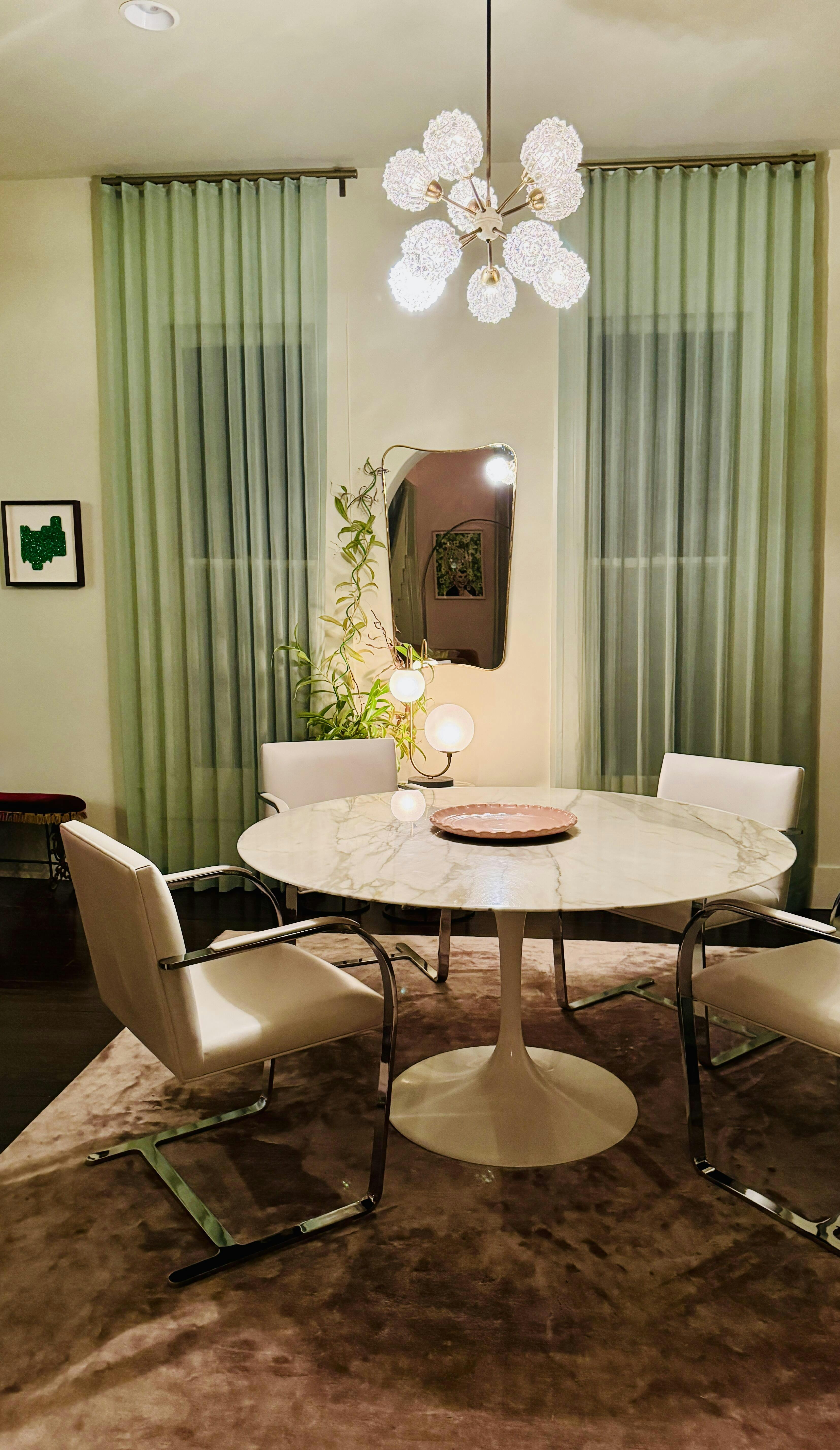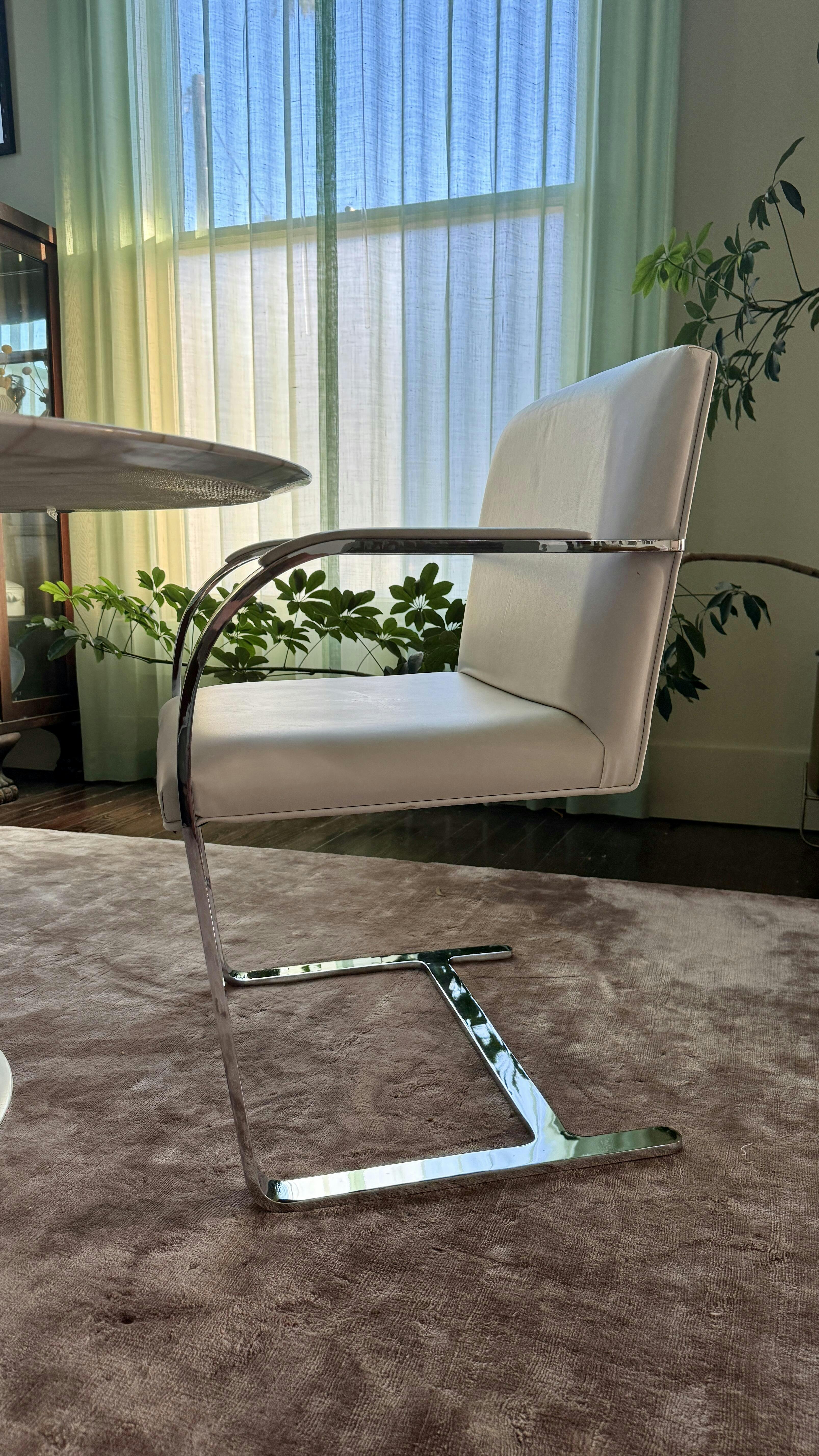 A timeless expression of modernist design, this set of four Brno-style dining chairs is a faithful reproduction of the iconic chair designed by Ludwig Mies van der Rohe in 1930 for the Tugendhat House.