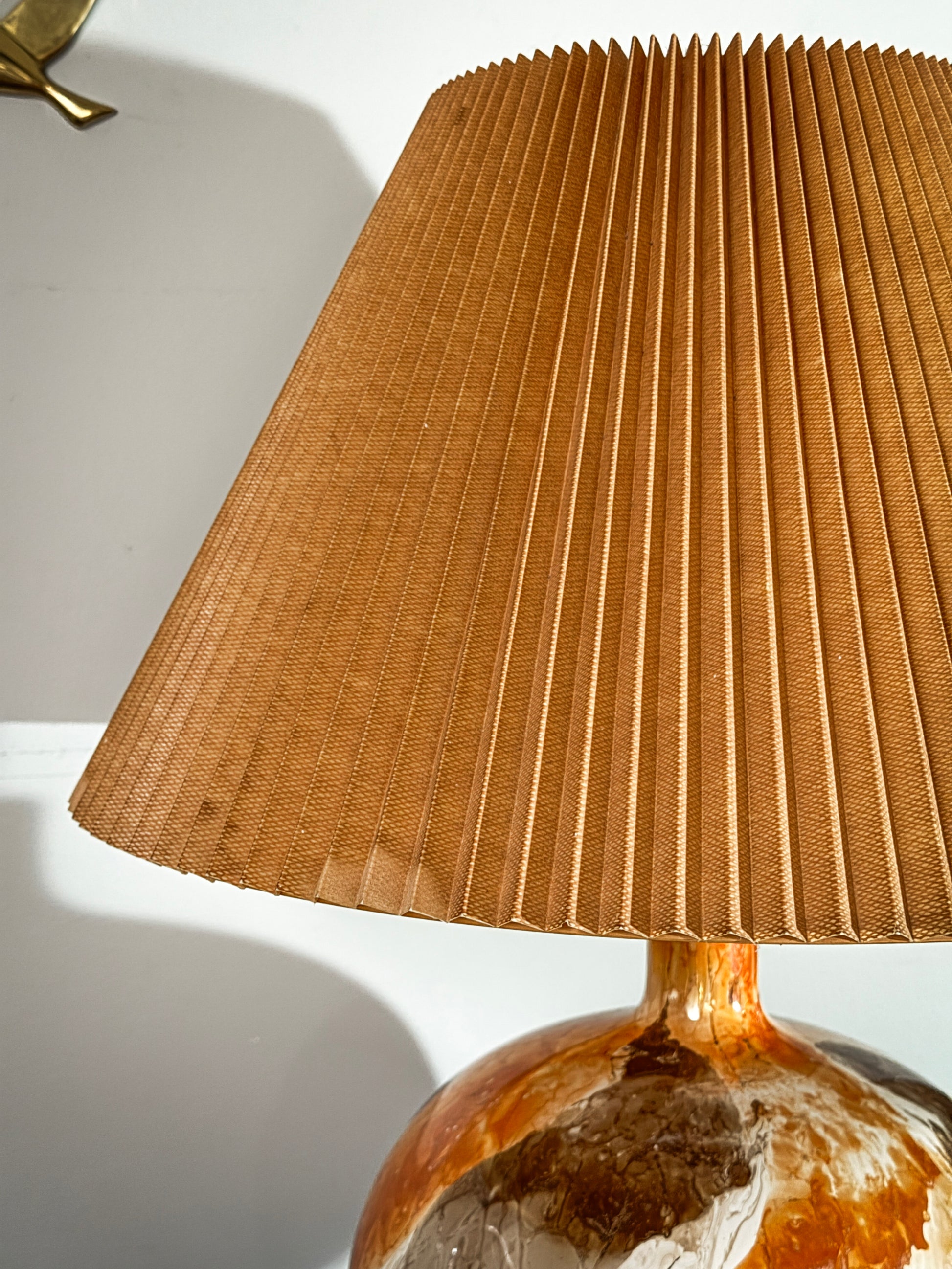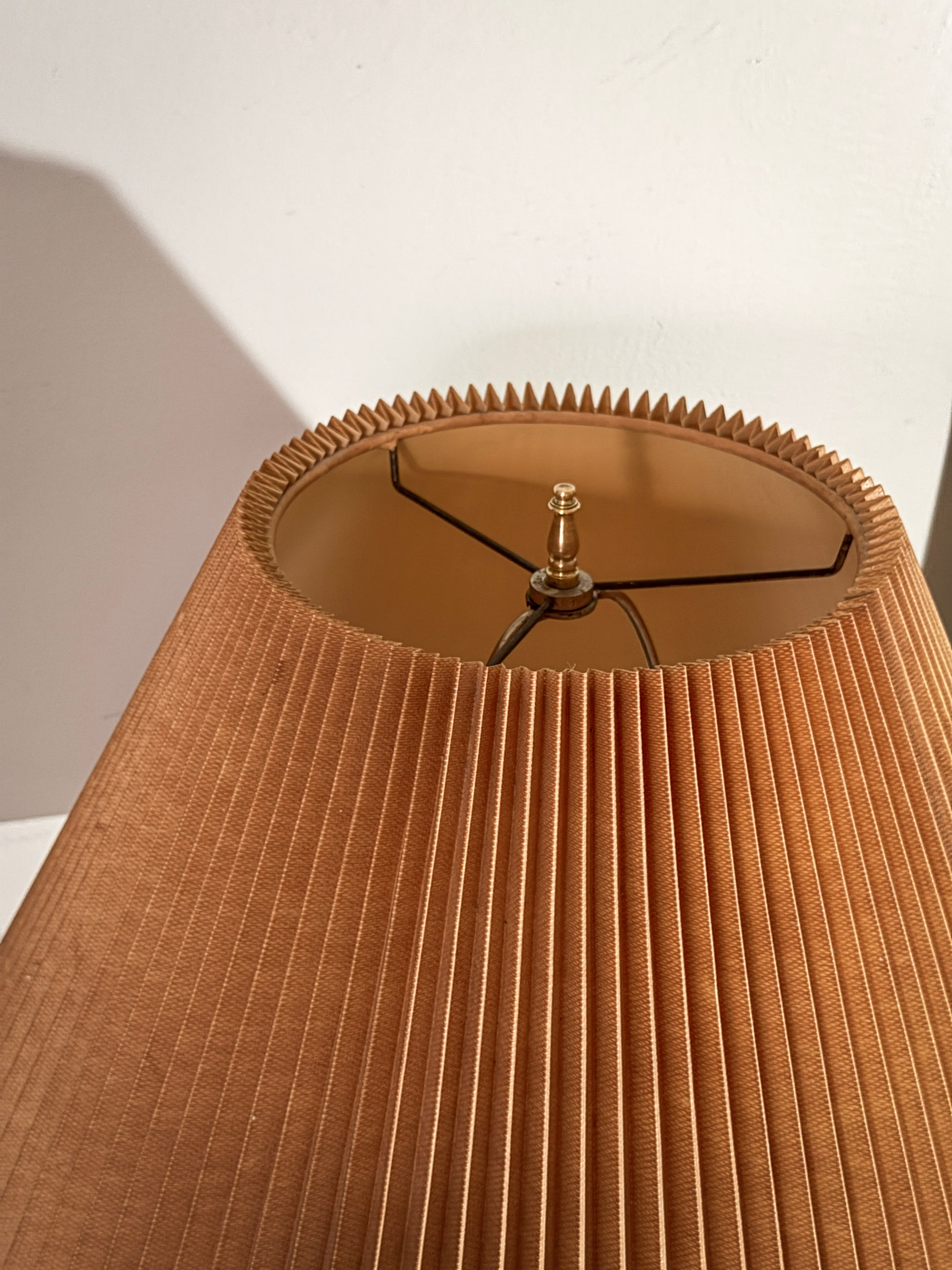 Topped with its original pleated shade in burnt orange, this lamp casts a warm ambient glow and adds an artistic, bohemian touch to any modern or eclectic interior.