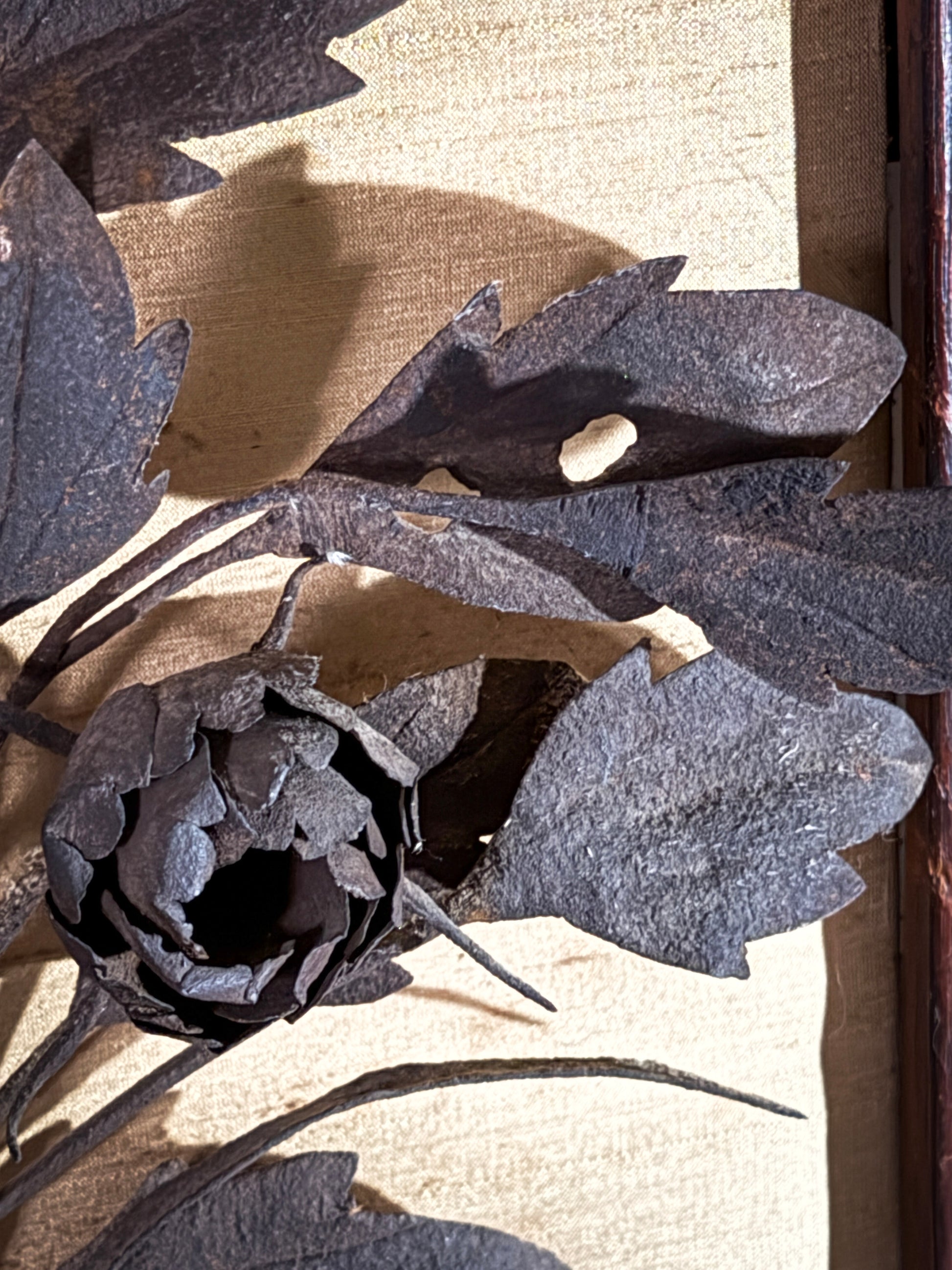 These panels are old, possibly mid-century or earlier, and entirely handmade—each leaf, stem, and petal is individually shaped and applied with care.