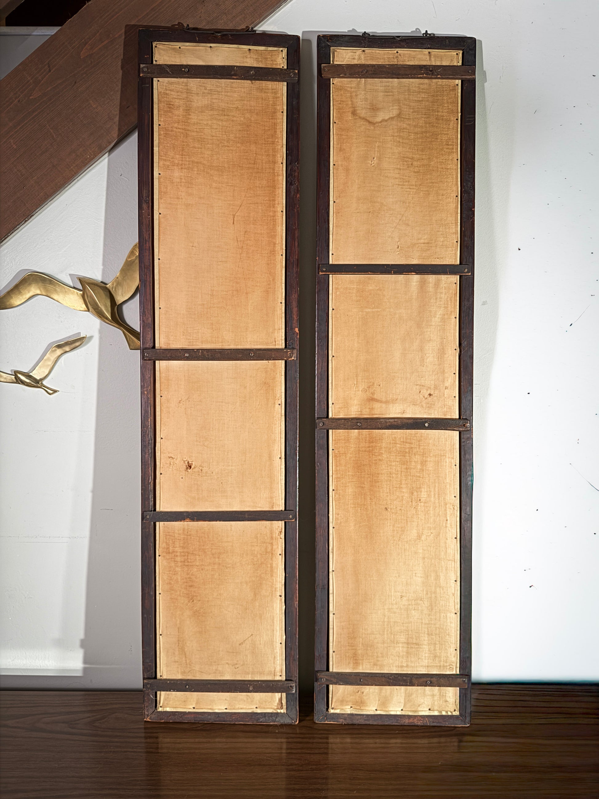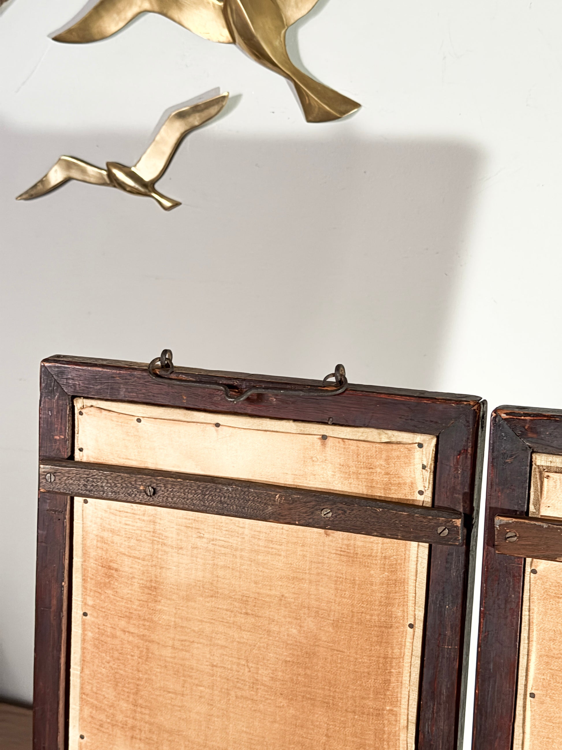 Framed in dark wood with a time-worn patina, these wall hangings speak to craftsmanship and quiet elegance, perfect for collectors of Asian decorative arts, wabi-sabi interiors, or Japandi-inspired spaces.