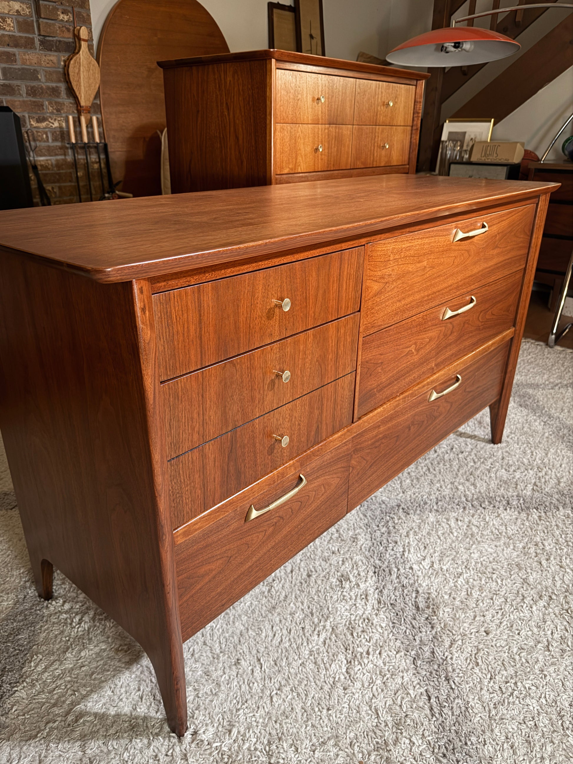 This 6-drawer Drexel “Modern” lowboy dresser stuns with its sculptural pulls, warm walnut glow, and minimalist elegance. Perfectly balanced proportions meet subtle craftsmanship details, like the asymmetrical drawer configuration and tapered legs.